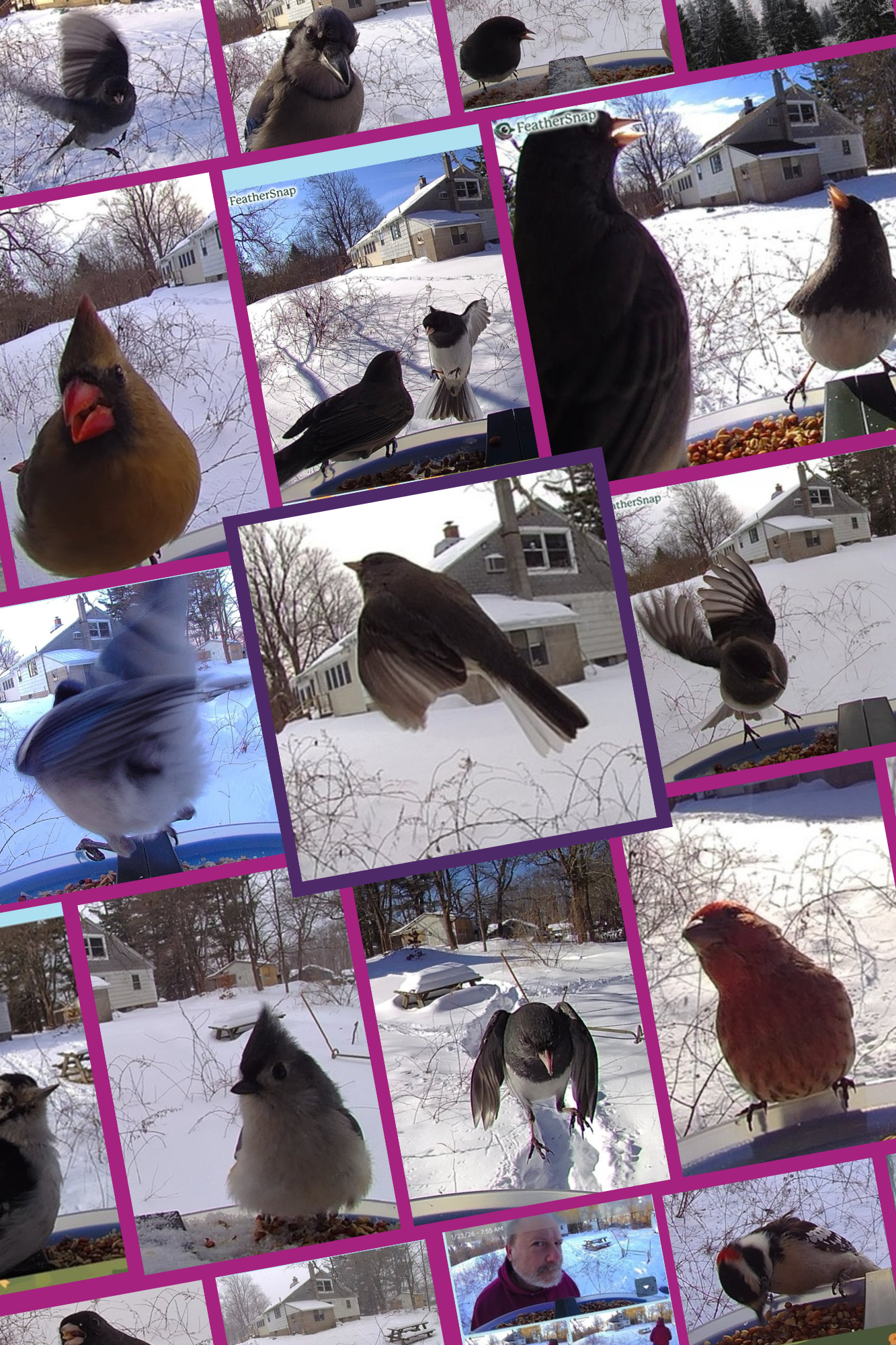 My sweetheart, the playful fella hidden in the collage, recently gave me a bird feeder with a camera that sends photos straight to my phone, and I’m completely taken with it. From sun-up to sun-down, these small glimpses of the outside world have been arriving like little notes of comfort—especially welcome during weeks when so much has felt heavy and the air so cold.