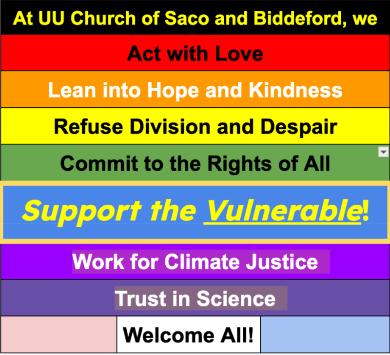 By Mail: Send donations and pledge payments to: UU Church of Saco & Biddeford, 60 School Street, Saco, ME 04072