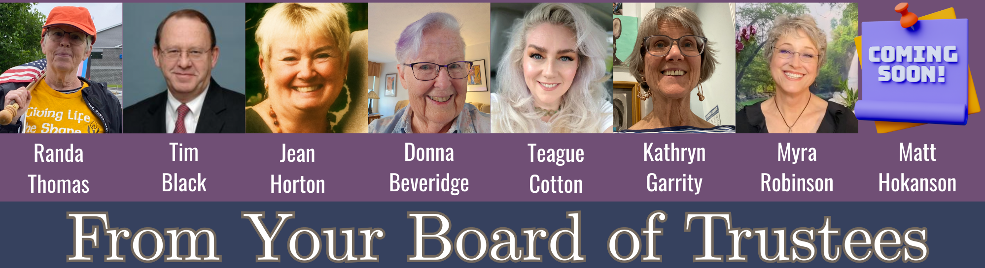 As always, you are invited to our meetings on the first Wednesday of each month at 10 am. Please contact any BoT member if you have comments or questions.