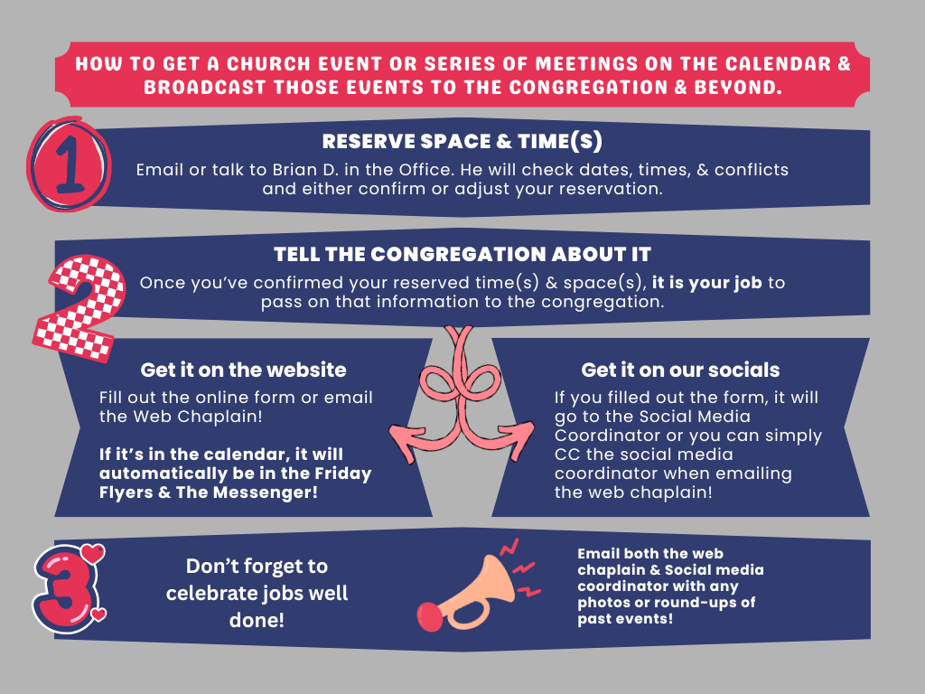 To help make things clearer, I’d like to share some simple guidelines on how congregants should reserve a space and then submit event information for the website, Friday Flyers, social media, and of course, this monthly Messenger. I hope this will make the process easier and more straightforward for everyone.