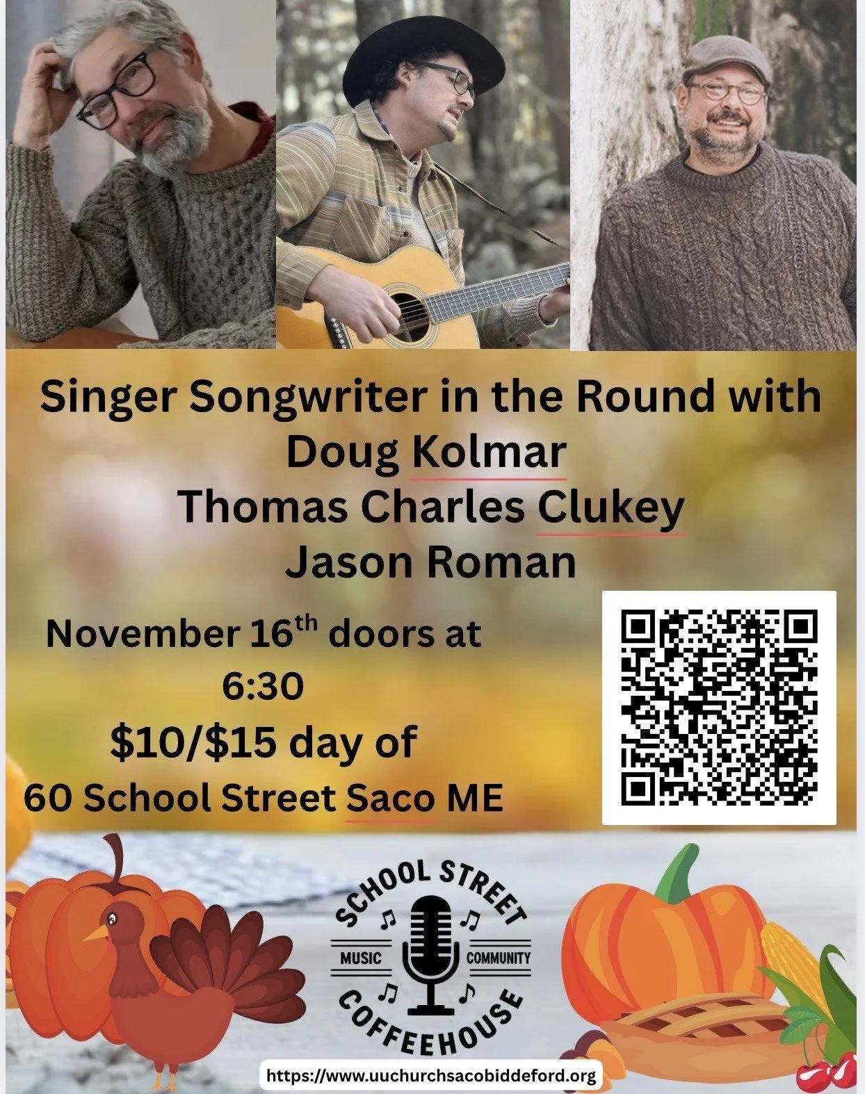School Street Coffee House: Singer Songwriter in the Round with Doug Komar, Thomas Charles Clukey, and Jason Roman Sunday, November 16, 2025 6:30 PM 8:30 PM Google Calendar ICS